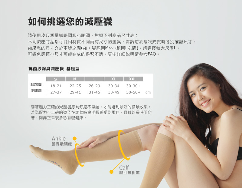 你可以依靠嚴謹品管的 TXG漸進式壓力,襪身的每一圈皆經精密設計向上遞減的壓力梯度,符合人體流體力學舒適設計,雙腿輕鬆行走舒適。支持腿部的關鍵力量,讓雙腿有力感受更輕盈! 長時間的久坐或是站立,腿部固定同一個姿熱不動,就有讓踝部壓力無法釋放。 |