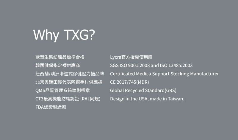 與一般Nylon有著不可跨越的差異。並且,在化學纖維中擁有高穩定的特色,是醫療級減壓系列產品的優先考量。 在亞熱帶地區的超過30度以上高溫夏季,因地處溫度和各人流汗程度不一,如果因氣熱有敏感現象建議調整穿著時間。 |