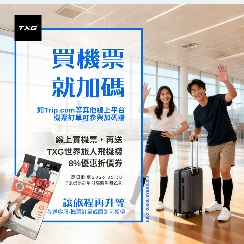 飛行時久坐、長途搭車,或旅行需要每日往返奔走及自助旅行時使用。 訂機票,即享旅程體感升等 向線上客服展示機票訂購成功截圖 (含訂單編號、航班號、日期、訂購人姓名) 即可取得單雙世界旅人飛機襪 8%優惠回饋券。*資料僅供確認不作他用。 以下網站訂機票: trip、ctrip、易遊網eztravel、skyscanner、易飛網ezfly、雄獅旅遊 liontravel、airpaz、expedia、 玉山票務、airbare go、webticket、捷星航空、長榮航空、中華航空、立榮航空、國泰航空、 台灣虎航、華信航空、樂桃航空、星宇航空、日本航空 以下旅行社訂機票: 五福旅遊、山富旅遊、東南旅遊、溫馨旅行社、燦星旅遊、永安旅遊、中天旅行社、太平洋旅行社